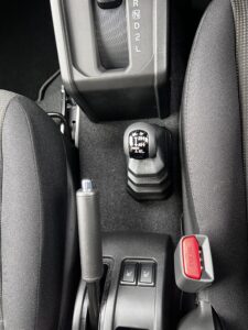 まずは、シートを少し後ろに下げ、ブレーキを上げた状態にします。